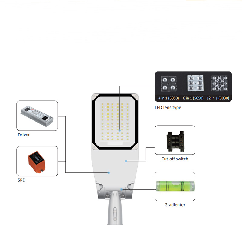 - Aluminiumliggaam is gemaak van ADC12-aluminiumgietwerk, die oppervlak wat deur spuitverf behandel is om korrosie en kleurbestendigheid te voorkom.