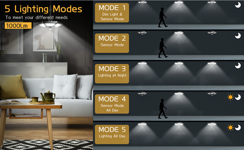 OBuite sonkragbewegingsensor-liggies met 5 beligtingsmodusse.
